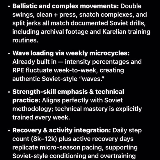 This training program uses techniques and training recovered from the Soviet Union’s Olympic training files, the USSR Sportivnaya Medicina archives, and personal interviews with retired Soviet athletes and defectors.